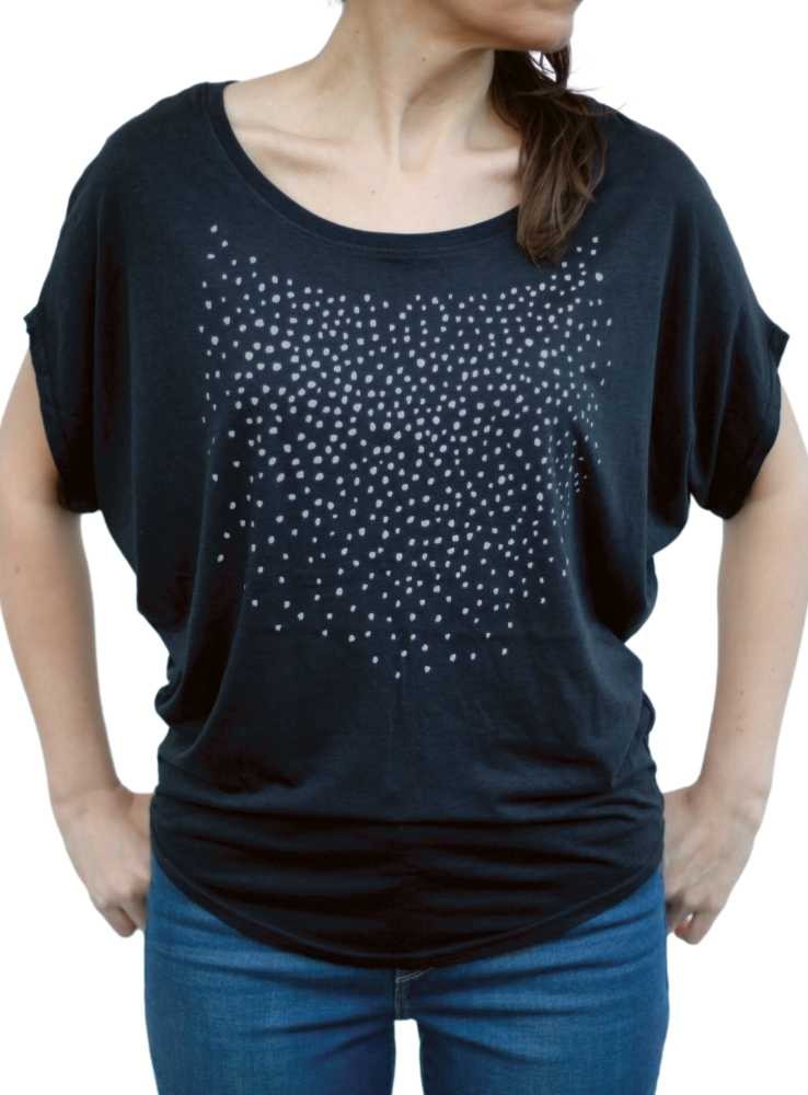 Bambusbluse med print på sort bundfarve. Motivet er designet og printet af Blackbird Supply i USA. Bambus oversize T-shirt i løs model med flagermusærmer. Unik og særlig bambusbluse med meget få styk produceret. Stor og løs foroven med stor halsudskæring, sidder kun til på hoften, se mål herunder