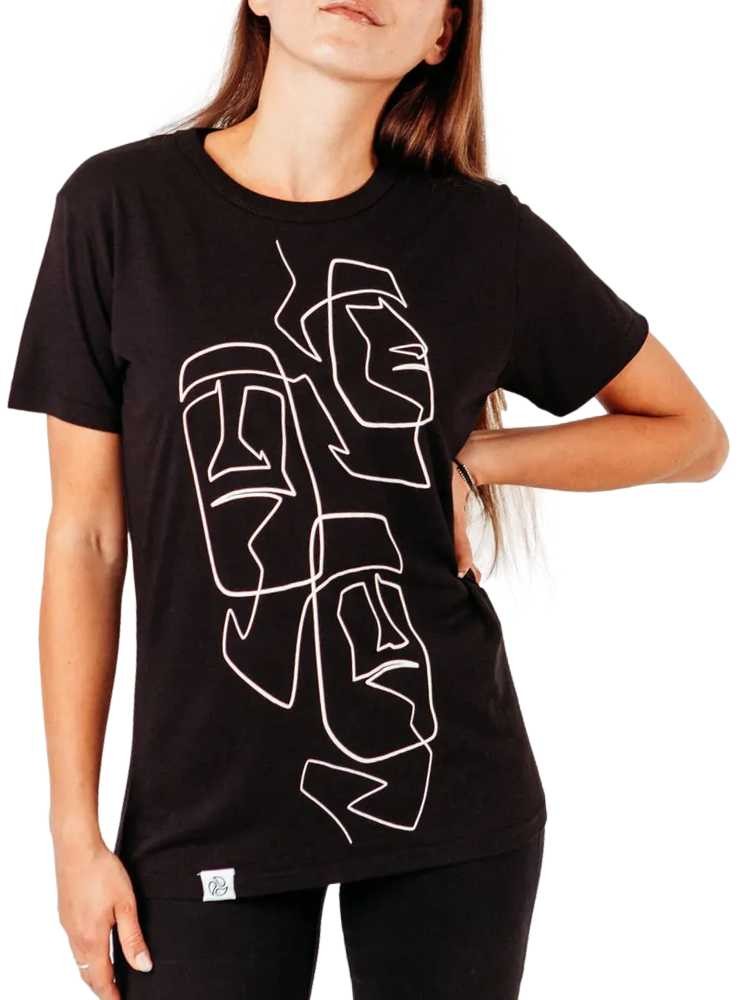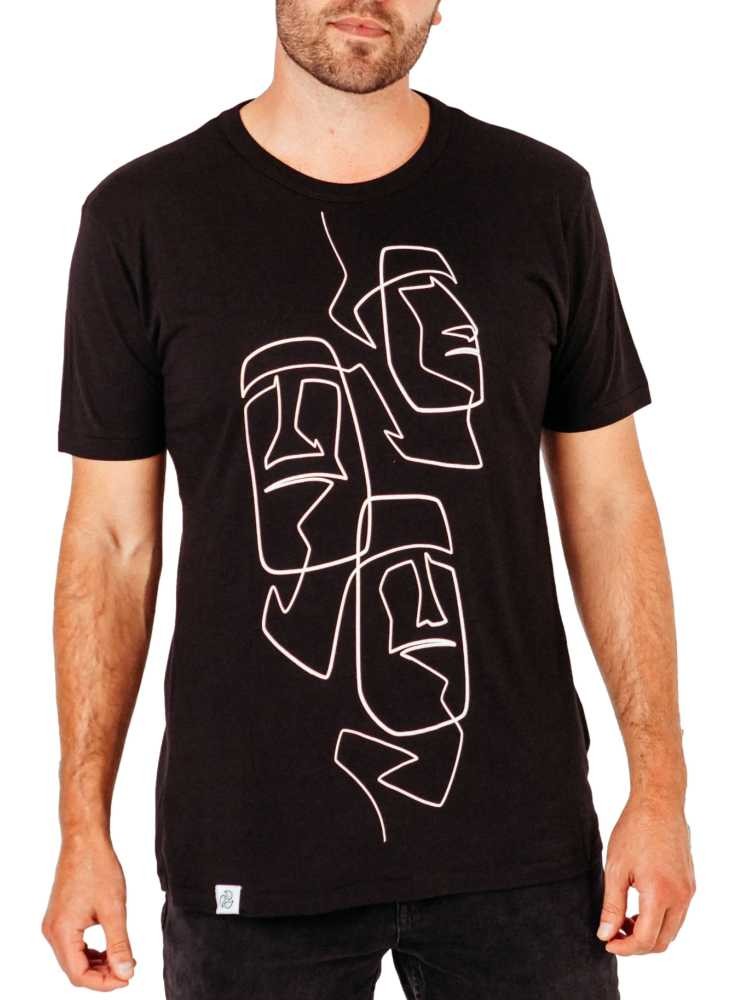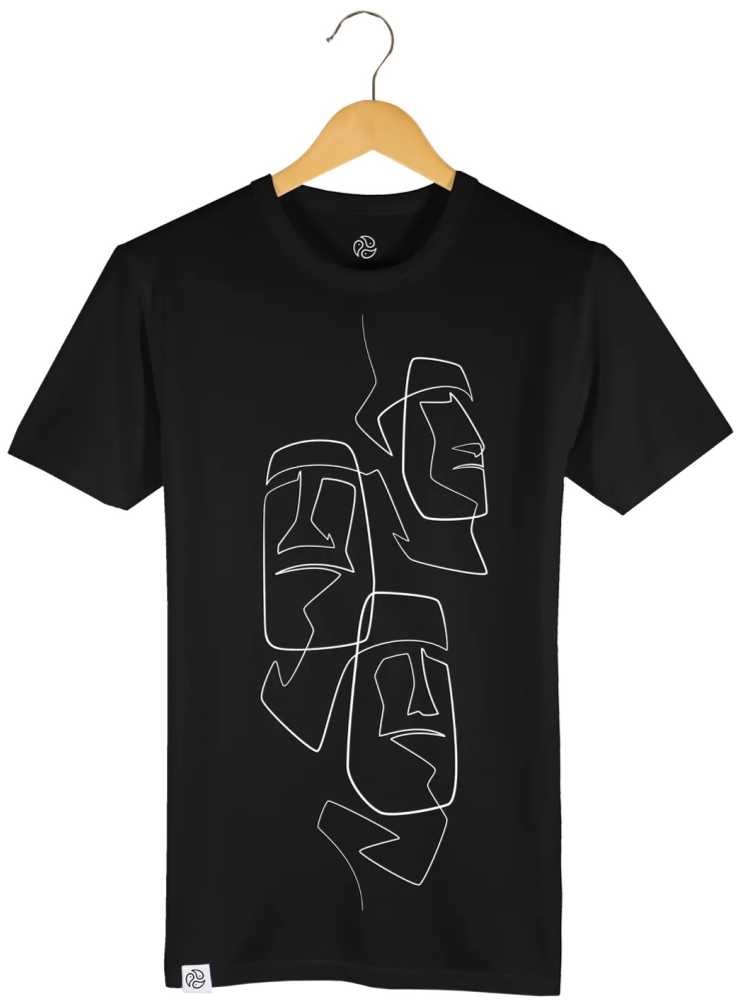 Bambus t-shirt med 30% økologisk bomuld, sort med hvidt print. Tegningen er inspireret af Påskeøen, og er tegnet i 1 ubrudt linje. Bambus T-shirten er designet til mænd, men iflg. designeren er den bestemt også til damer. Smart og minimalistisk design, blød bambus jersey, made in Turkey. Se mål længere nede↓